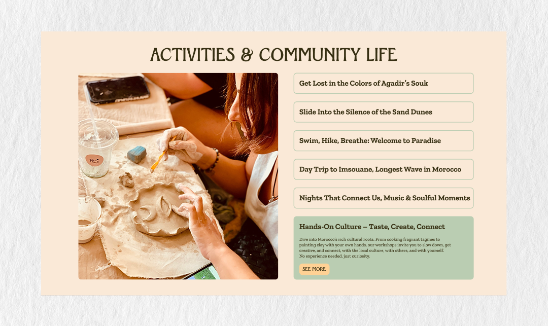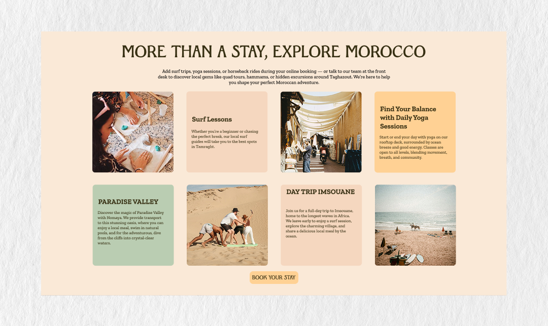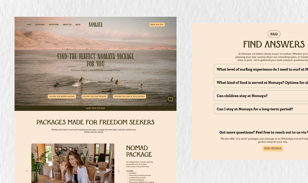 Création d'un site Webflow du design au développement en passant par la stratégie SEO pour le surf hotel NOMAYA au Maroc. Utilisation de Figma, Notion et Webflow ainsi que SemRush et Google analytics.